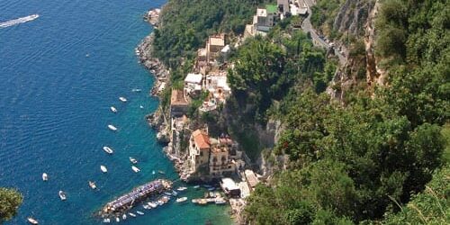 Conca dei Marini is a seaside town nestled in a bend of the Tyrrhenian Sea, in a blaze of lights and colors. Conca is divided in two: down low, the small flushes of water which reflected in a small bay; on top, rested on the hill, white painted houses, scattered among the orchards, olive groves and terraces of lemon that descend to the sea. All the places of the borgo are connected by Scalinatelle which make their way to our steps between the scents of aromatic herbs. There are six churches to see, all in a panoramic position. One is the church of San Pancrazio, since 1362. Olive trees all around and palm trees in the churchyard, wrapped in a Mexican light. Overlooking the sea there is the thirteenth century church of Sant’Antonio (actually dedicated to Saint John the Baptist) with a façade and a bell tower with a spire covered by majolica tiles. The former convent of Santa Rosa with the adjacent church of Santa Maria in Grado becomes increasingly more visible as you proceed toward Amalfi. It was erected on top of a sheer cliff overlooking the sea in 1681 for the will of sister Rosa Pandolfi, belonging to a rich local family. In the kitchens of the convent, the sfogliatella  “Santa Rosa”, one of the most renowned sweets of the Neapolitan tradition, was created. After the death of the last nun in 1912, the convent was converted into a hotel. In the church of Santa Maria di Grado the head of St. Barnabas is kept, being one of the most important relics in the city province. The other three places of worship are the church of San Michele Arcangelo in via San Michele, the chapel of the Immaculate Elm and the chapel of the Madonna della Neve at the marina. The visit to the emerald grotto is a must: a marine cave hidden in a fold of the coast, whose waters, engraved from a blade of light coming from an underground hole, get emerald reflections in a stunning landscape of the stalagmites and stalactites. Finally, the ancient watch tower of Capo di Conca.