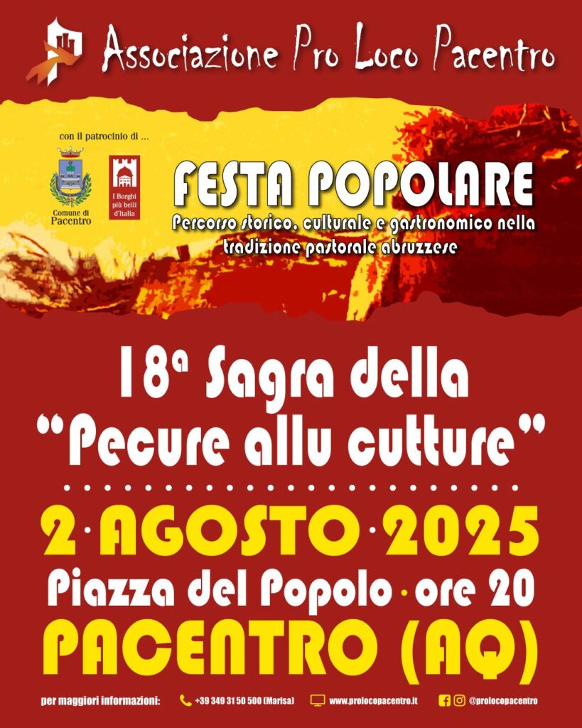 Nello splendido scenario della Piazza del Popolo di Pacentro (AQ), sabato 2 agosto 2025 prenderà vita la 18^ edizione della “Pecure allu cutture” (Pecora al cotturo), evento gastronomico che vuole ristabilire il legame storico di Pacentro con l’attività pastorale e gli scenari paesaggistici montani.