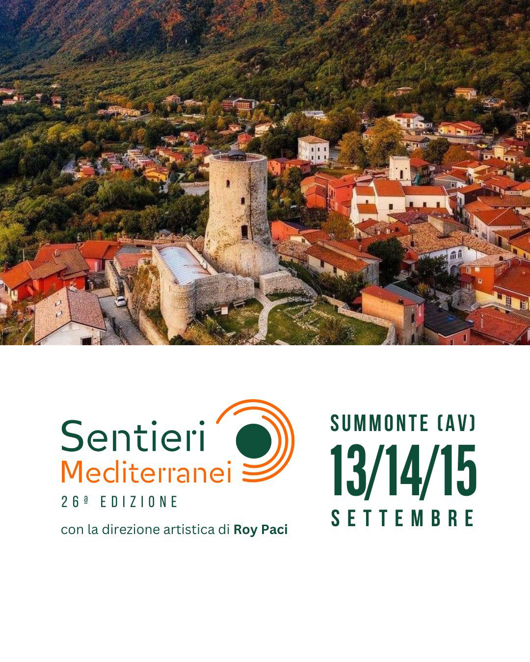 Presentazione della 26ª Edizione del Festival Sentieri Mediterranei Summonte (AV) | 13 – 15 Settembre 2024 Direzione Artistica: Roy Paci Il Comune di Summonte, uno dei borghi più belli d’Italia, è