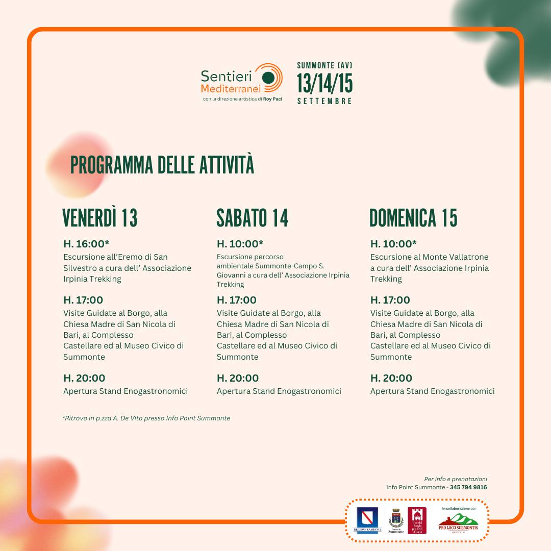 Il Festival Sentieri Mediterranei è molto più di un evento musicale: è un’occasione per scoprire le bellezze di Summonte e immergersi nella cultura del Mediterraneo, tra storia, natura e tradizioni. Il Festival è da sempre una manifestazione di rilievo per tutta l’Irpinia e un punto di riferimento per gli amanti della musica e delle escursioni.