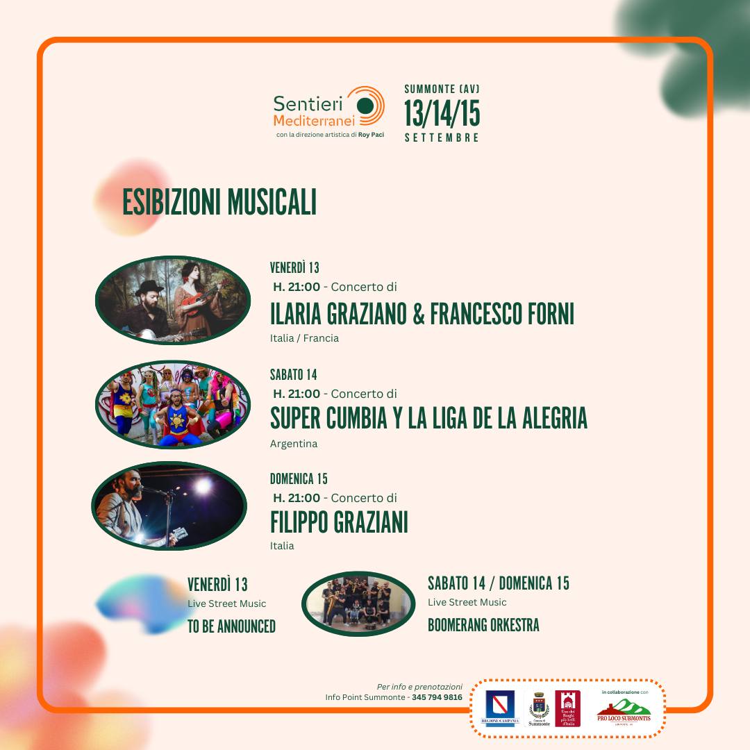 Il Comune di Summonte, uno dei borghi più belli d’Italia, è orgoglioso di annunciare la ventiseiesima edizione del Festival Sentieri Mediterranei, che si svolgerà dal 13 al 15 settembre 2024. Quest’anno, la direzione artistica è stata affidata al celebre musicista Roy Paci.