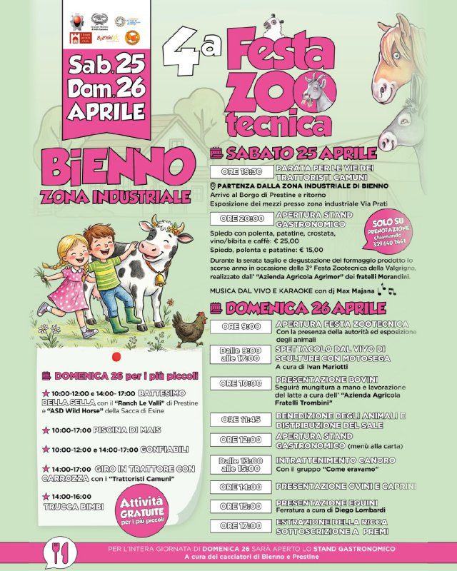 La Festa Zootecnica torna a Bienno! Un weekend speciale da vivere all’aria aperta, tra animali, tradizioni e sorrisiBienno – Zona Industriale Sabato 25 e Domenica 26 Aprile Grandi e piccoli
