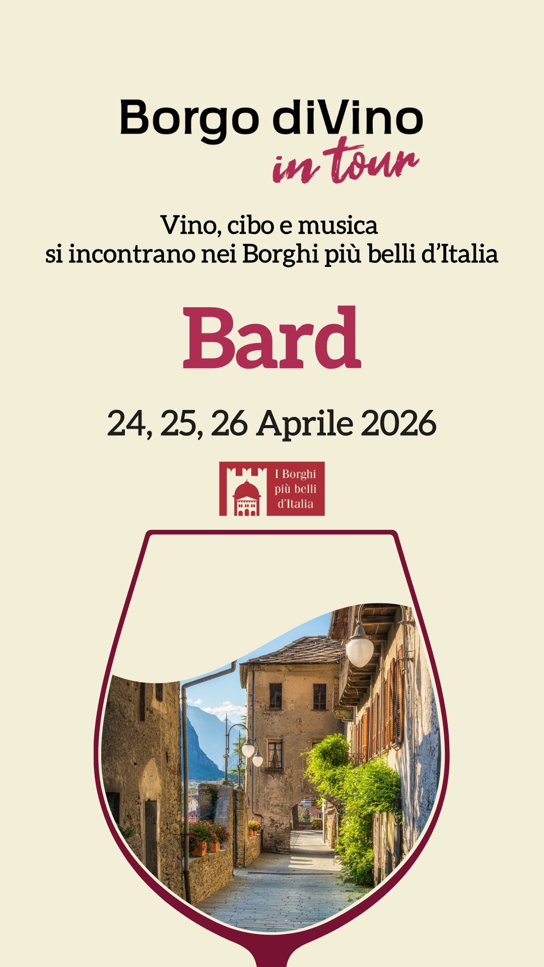 Borgo diVino in tour a Bard (AO): 24, 25, 26 aprile 2026. Vino, cibo e musica si incontrano nei Borghi più belli d’Italia Il fine settimana del 24,