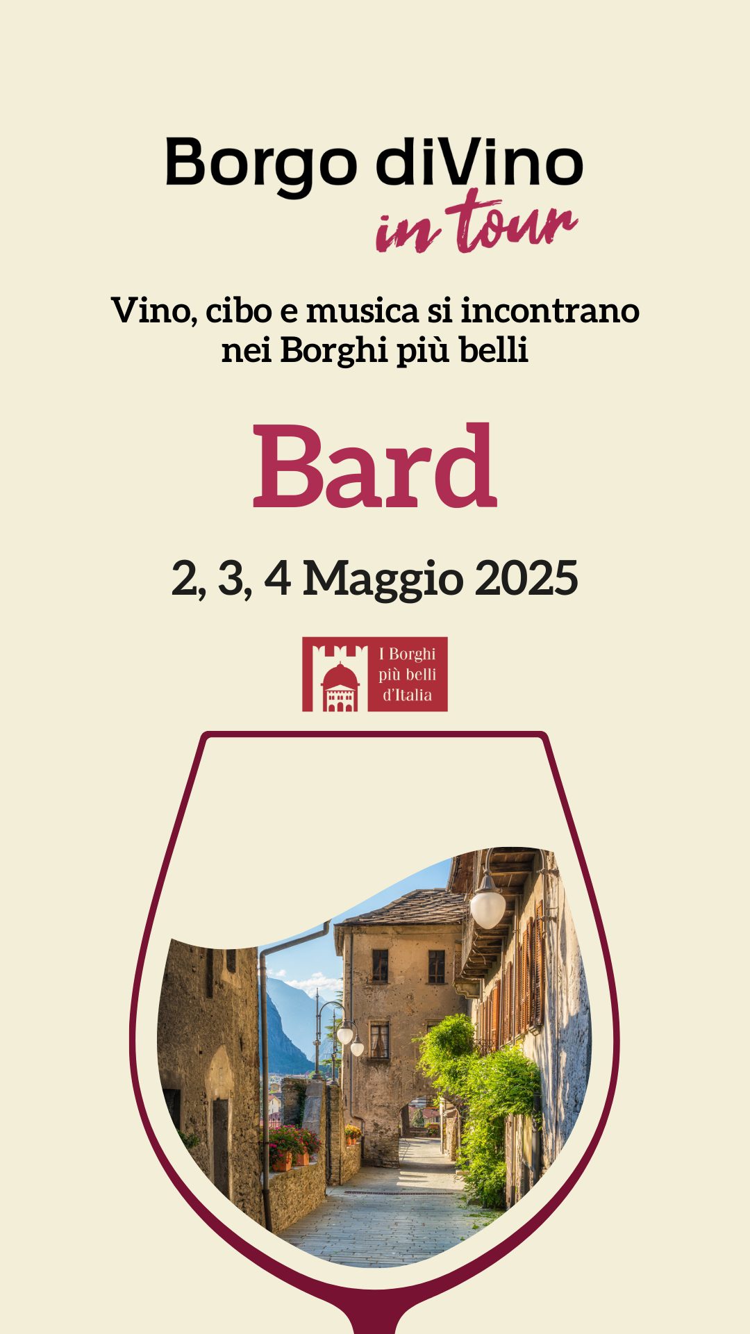 Il fine settimana del 2, 3 e 4 maggio Bard ospiterà per il secondo anno consecutivo Borgo diVino in tour, il ciclo di eventi dedicato alle eccellenze del buon bere promosso dall’Associazione “I Borghi più belli d’Italia”. Un intero weekend di degustazioni con centinaia di proposte da tutto il Paese.