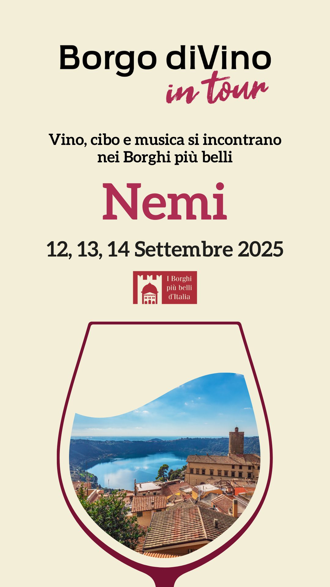 Giunge a Nemi la diciassettesima tappa di Borgo diVino in tour 2025, la rassegna enologica promossa dall’Associazione “I Borghi più belli d’Italia” e organizzata da Valica SpA, con il patrocinio dell’Associazione Nazionale Città del Vino.