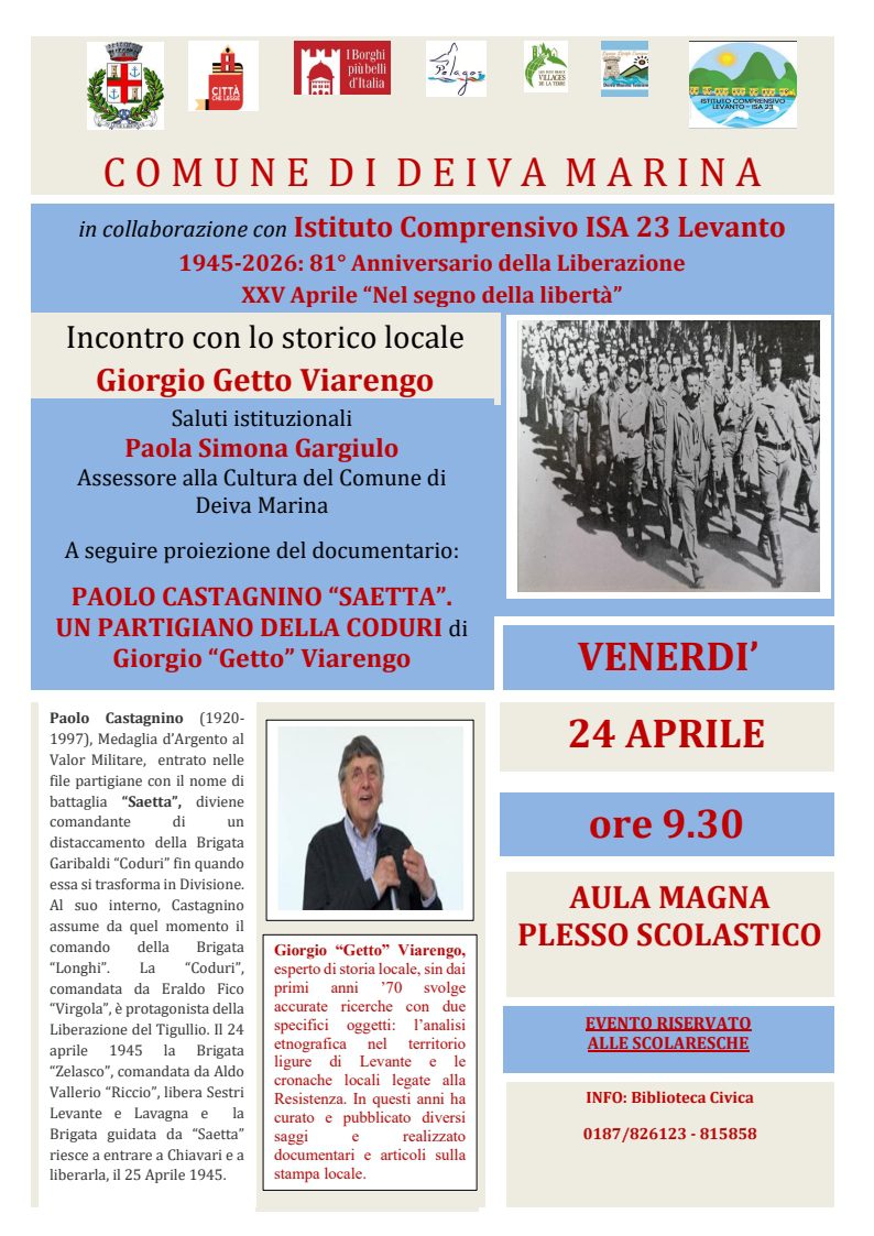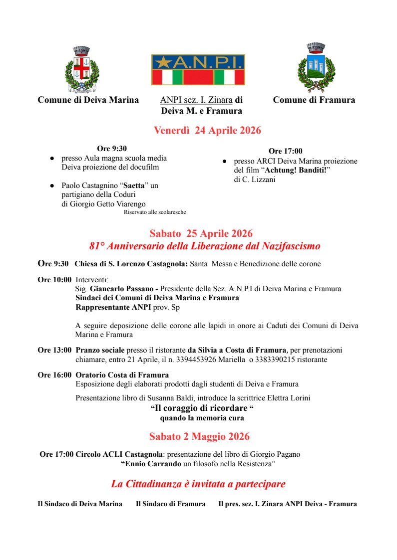 In occasione delle celebrazioni dell’81° anniversario della Liberazione, per onorare la memoria di chi ha lottato per la libertà, la democrazia e la Costituzione italiana, si inviano in allegato le iniziative che il Comune di Deiva Marina organizza in collaborazione con la locale sezione ANPI Deiva M./Framura per i cittadini e le scuole.