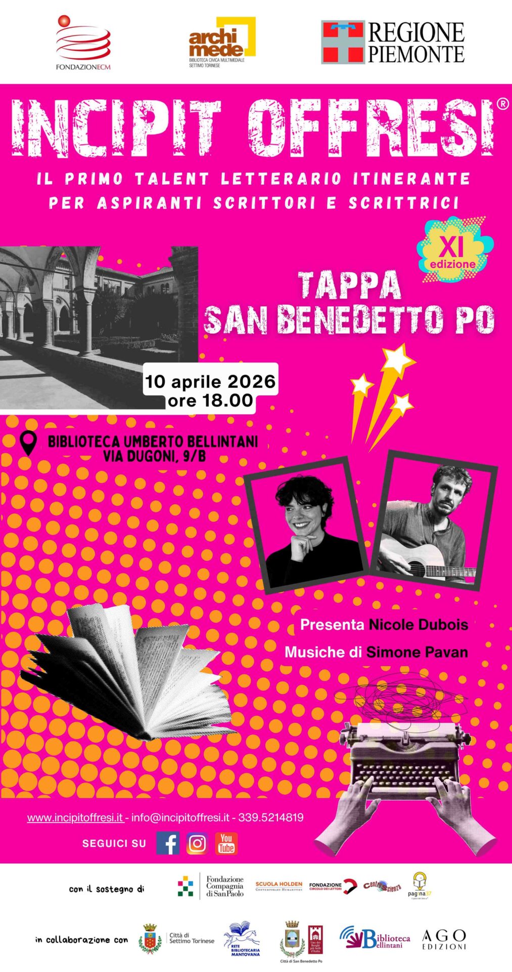 Venerdì 10 aprile 2026, alle ore 18.00, la Biblioteca Comunale “Umberto Bellintani” di San Benedetto Po, in via Dugoni 9/b, ospiterà una nuova tappa di “Incipit Offresi”, l’undicesima edizione del primo talent letterario itinerante dedicato ad aspiranti scrittori e scrittrici. A condurre la serata sarà Nicole Dubois, con accompagnamento musicale di Simone Pavan.