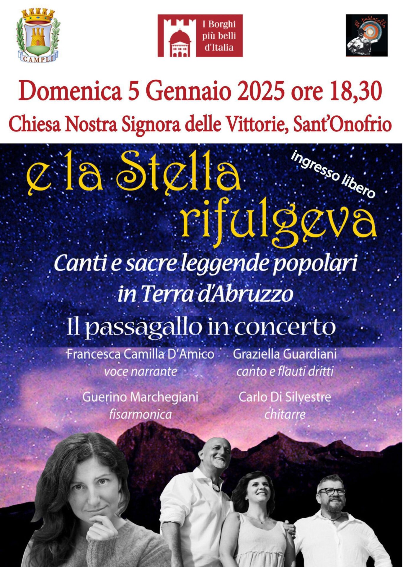 “E la stella rifulgeva”* è un concerto che celebra i canti e le leggende sacre della tradizione orale abruzzese, focalizzandosi sui rituali legati al solstizio d’inverno. Lo spettacolo segue un percorso temporale che simboleggia la morte e la rinascita, toccando momenti significativi come l’Annunciazione, la Natività, il Capodanno, l’Epifania, Sant’Antonio Abate e il Carnevale. I canti, originari di rituali pagani poi adattati al cristianesimo, riflettono aspetti di purificazione e protezione, evidenziando una religiosità popolare, quotidiana e domestica, lontana da concetti trascendenti.