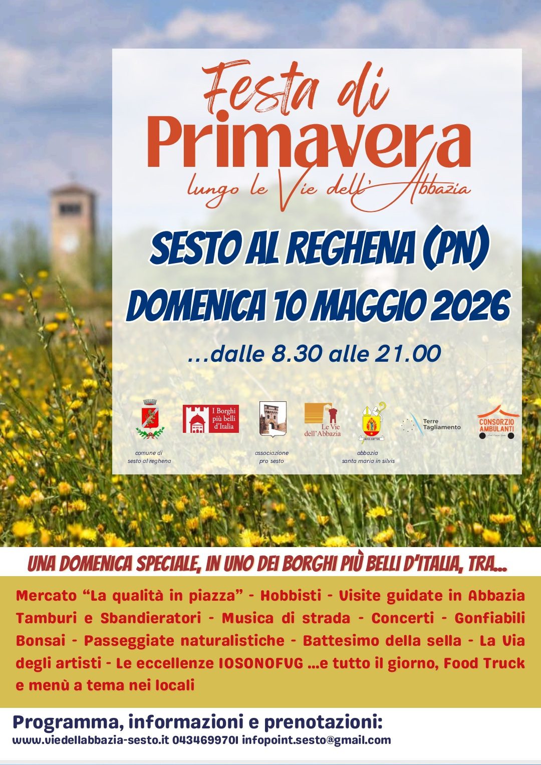 Cresce l’attesa per l’edizione 2026 di “Festa di Primavera lungo le Vie dell’Abbazia”, celebrazione della bella stagione che si terrà domenica 10 maggio a Sesto al Reghena (uno dei Borghi più Belli d’Italia).