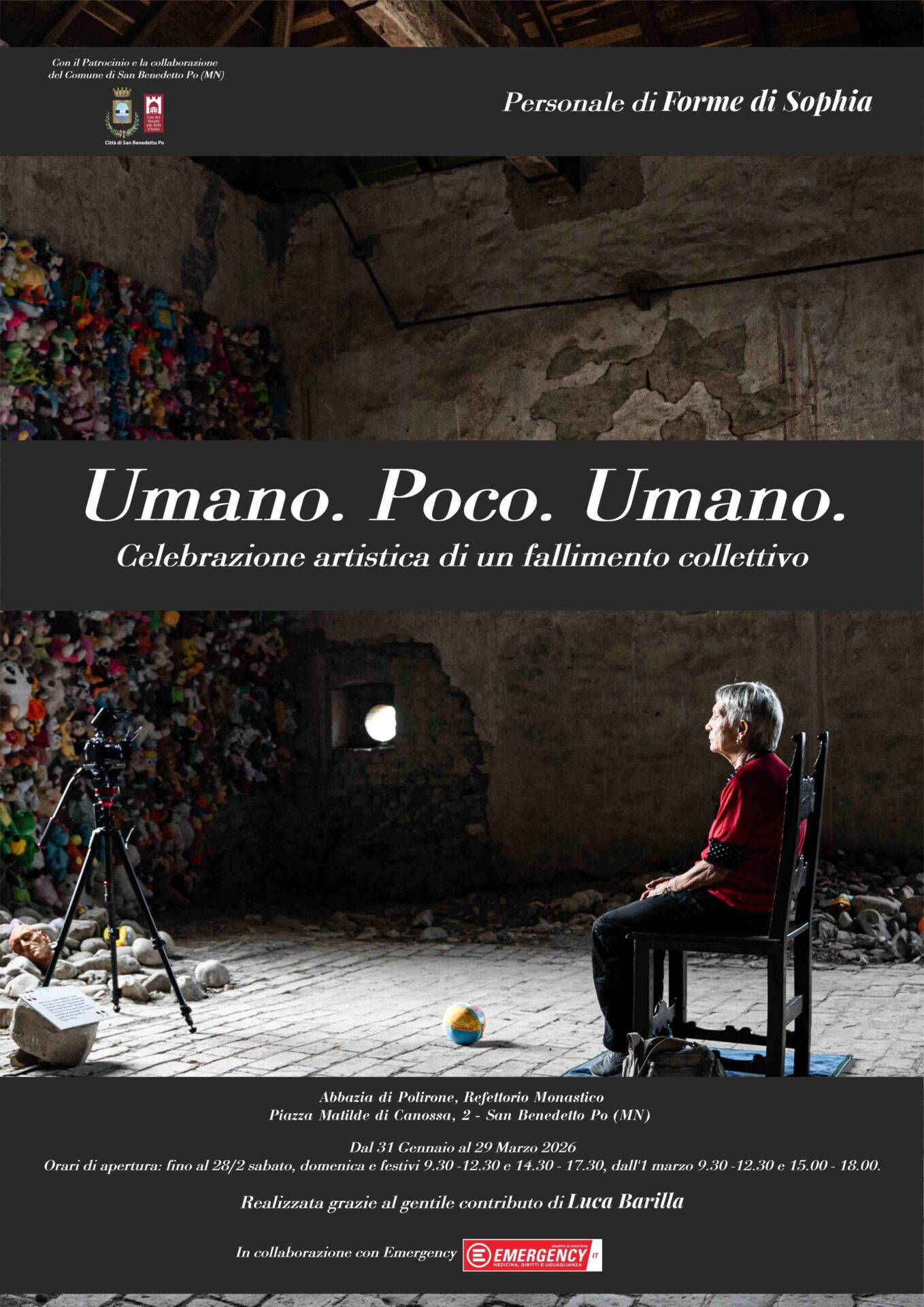 Sabato 31 gennaio 2026, alle ore 17.00, inaugura presso l’ex Refettorio Monastico del Museo Polironiano la seconda edizione di Umano.Poco.Umano, personale dell’artista Andrea Riccò (Forme di Sophia), in collaborazione con Emergency: un percorso immersivo che interroga la nostra responsabilità collettiva di fronte alla disumanizzazione contemporanea.