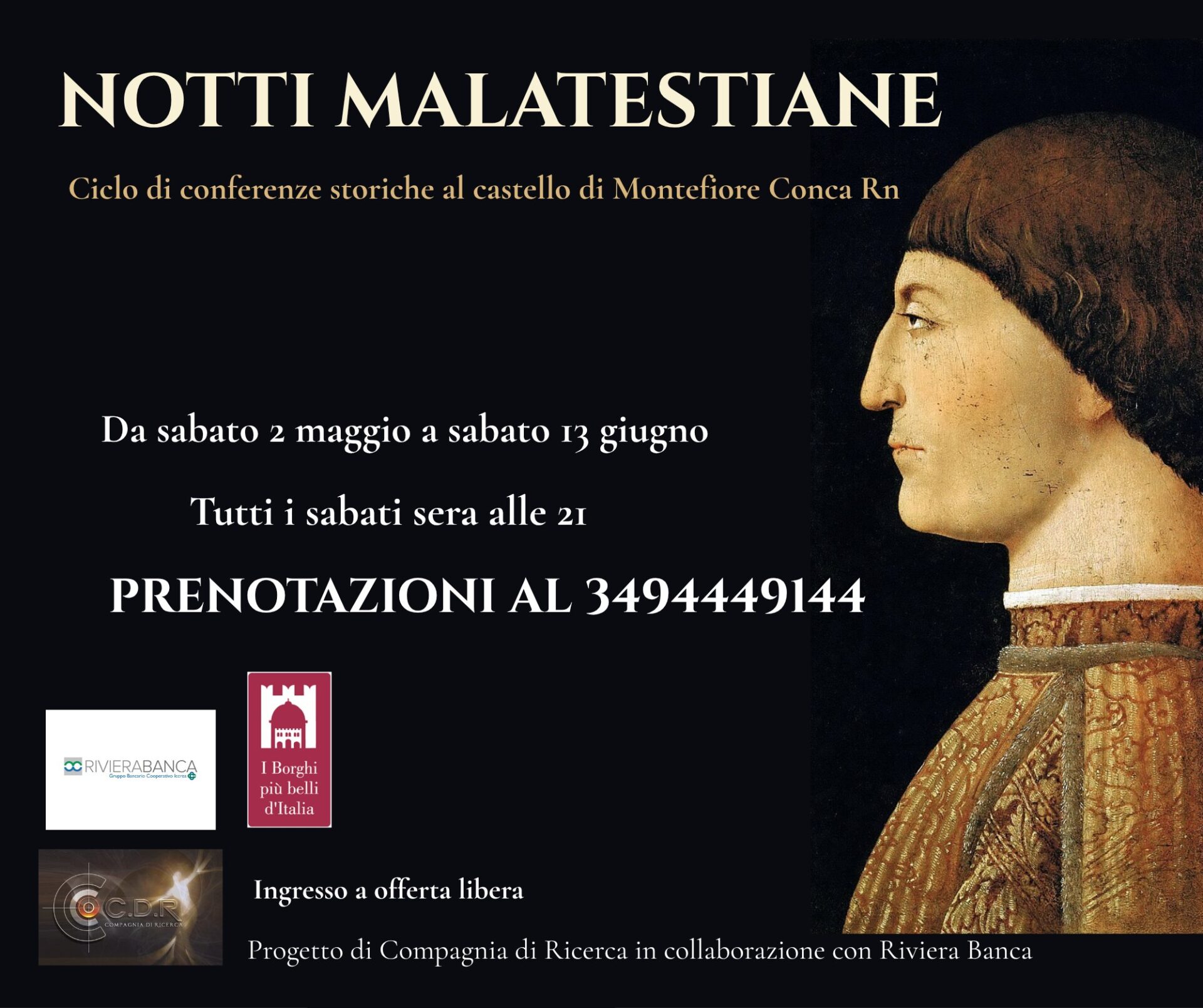 Le antiche mura del suggestivo Castello di Montefiore Conca (RN) si preparano a riaccendere i riflettori sulla storia con l’inaugurazione delle “Notti Malatestiane”. Questo prestigioso ciclo di conferenze storiche prenderà il via sabato 2 maggio e accompagnerà il pubblico ogni sabato sera alle 21, fino al 13 giugno, offrendo un’immersione profonda nel ricco patrimonio culturale e storico del territorio.