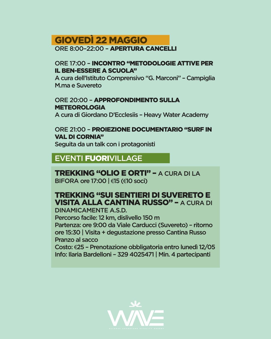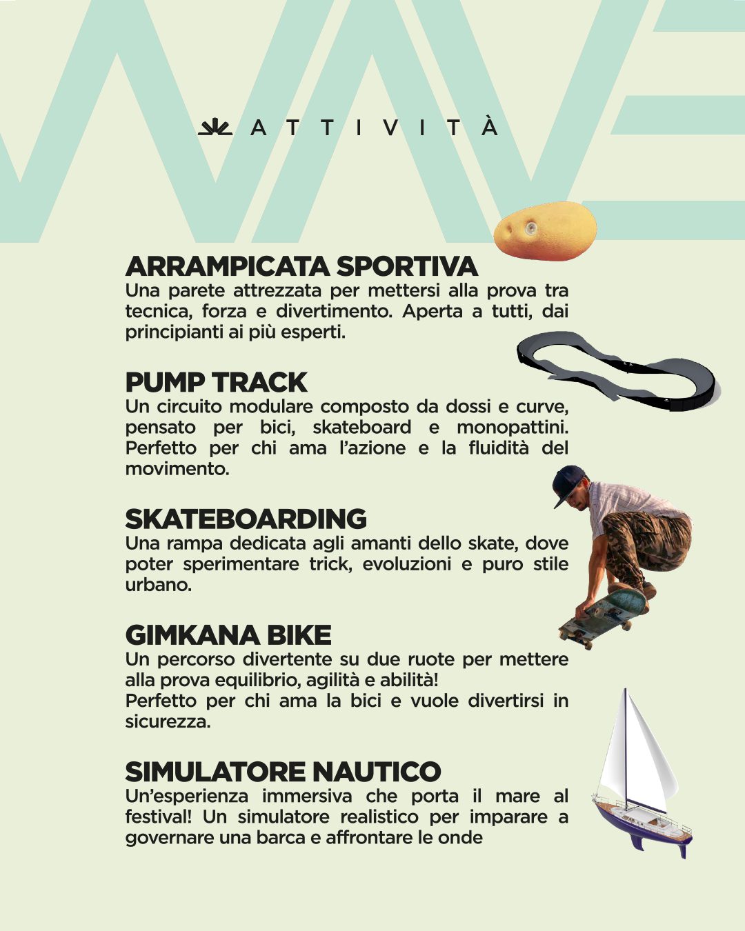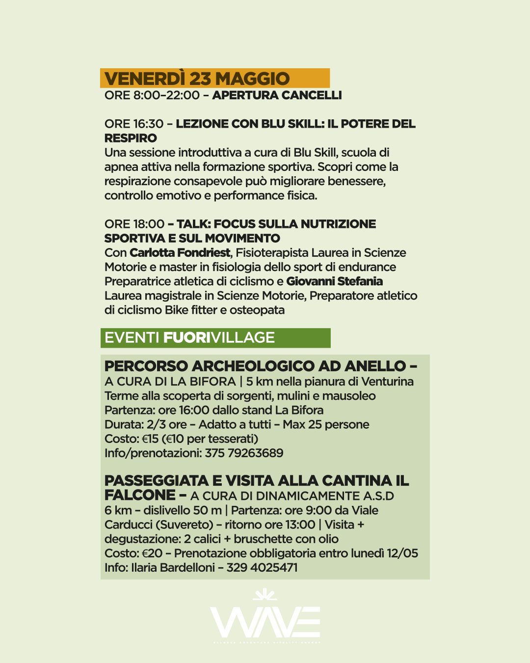 E ancora talk, laboratori, spettacoli, street food e tante sorprese: WAVE è un invito aperto a esplorare, sperimentare, divertirsi. Un luogo dove sport, natura e persone si incontrano in un’unica, grande vibrazione.