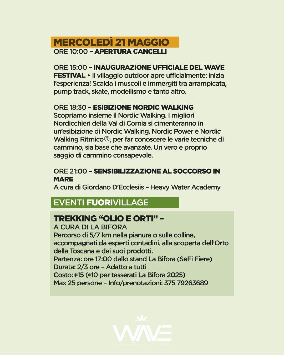 Dal 21 al 25 maggio 2025, Venturina Terme (Campiglia Marittima) diventa il cuore pulsante dell’avventura su due ruote e dello spirito outdoor con due eventi straordinari: Tuscany Trail, il più grande evento di bikepacking al mondo, e WAVE – Tuscany Outdoor Festival, il primo vero villaggio dell’outdoor in Toscana. TUSCANY TRAIL: UN’ESPERIENZA CHE LASCIA IL SEGNO Con oltre 6000 partecipanti attesi da tutto il mondo, Tuscany Trail si conferma l’evento di riferimento per gli amanti del bikepacking. Un itinerario ad anello di oltre 430 km con circa 5300 metri di dislivello positivo, ideale per bici gravel e MTB, che attraversa borghi medievali, colline toscane, città d’arte e paesaggi naturali mozzafiato. Ma il Tuscany Trail è molto più di una semplice pedalata: è una sfida personale, una scoperta lenta, un viaggio interiore. È un evento “no race” pensato per tutti, dai ciclisti esperti ai principianti, e offre un percorso accessibile, immersivo e tecnicamente non impegnativo, che valorizza il patrimonio naturale e culturale della Toscana. WAVE – TUSCANY OUTDOOR FESTIVAL: The village of TuscanyTrail In contemporanea con il Tuscany Trail, prende vita WAVE, il festival che celebra la cultura outdoor a 360°. Dal 21 al 25 maggio, presso il SEFI Centro Fiere di Venturina Terme, WAVE sarà un grande spazio esperienziale dedicato allo sport, alla natura, all’incontro e alla condivisione. Un vero e proprio villaggio dell’outdoor con attività gratuite e per tutte le età: Arrampicata sportiva Pump track per sfide ad alta velocità Gimkana bike per testare agilità e coordinazione Skate ramp per acrobazie e libertà Simulatore nautico per cavalcare le onde… anche senza mare! E ancora talk, laboratori, spettacoli, street food e tante sorprese: WAVE è un invito aperto a esplorare, sperimentare, divertirsi. Un luogo dove sport, natura e persone si incontrano in un’unica, grande vibrazione. UN TERRITORIO PROTAGONISTA Tuscany Trail e WAVE rappresentano un’occasione unica per valorizzare e promuovere il territorio di Campiglia Marittima – Venturina Terme e della Val di Cornia, che si conferma meta privilegiata per il turismo attivo e sostenibile. Un evento che unisce sport, cultura, promozione del territorio e sostenibilità, attirando visitatori, atleti e famiglie da tutta Italia e dall’estero. __________________________________ MERCOLEDI 21 MAGGIO Ore 10:00 – Apertura cancelli Ore 15:00 – Inaugurazione ufficiale del