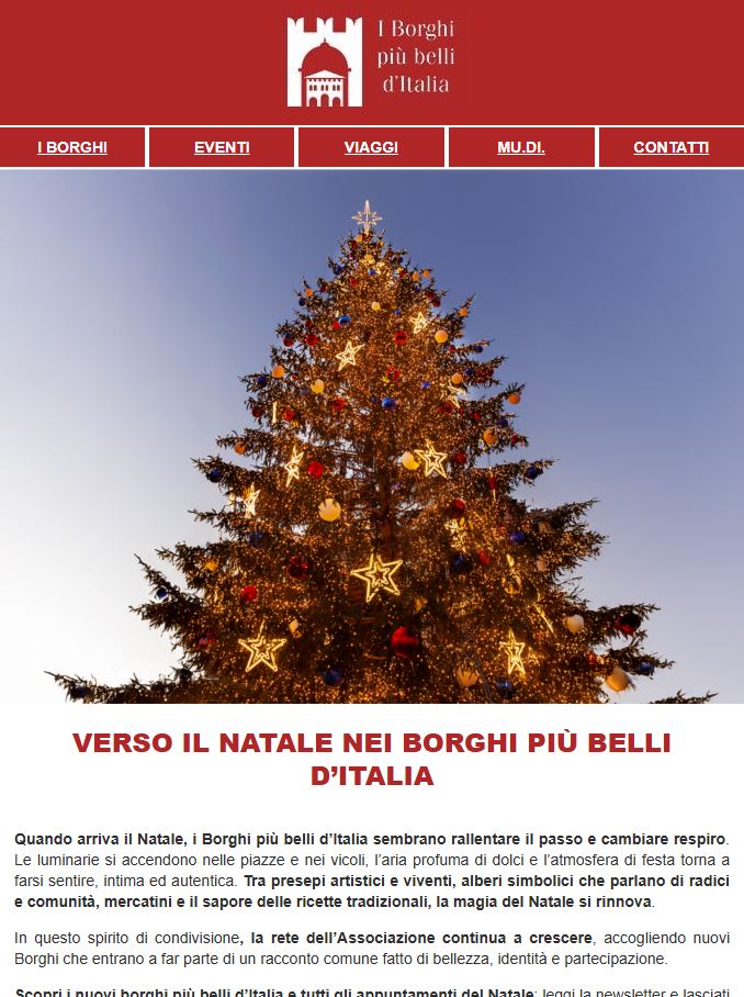 Entra a far parte della nostra community iscrivendoti alla Newsletter dei Borghi più belli d’Italia: l’iscrizione è gratuita e ti permetterà di ricevere le novità più interessanti dai nostri borghi, notizie sull’attività dell’Associazione e tanti eventi, approfondimenti e vantaggi esclusivi.