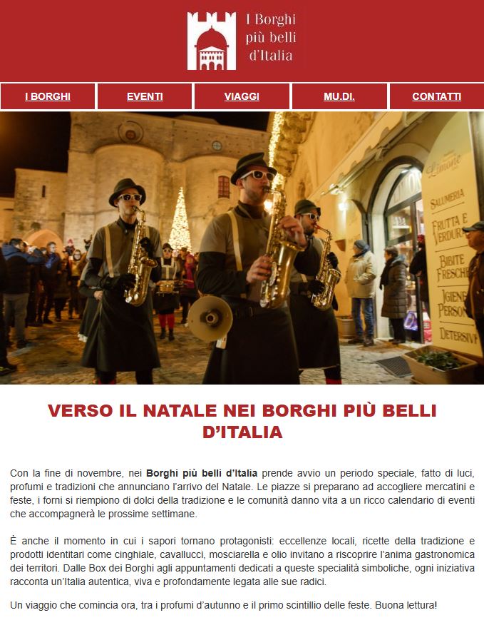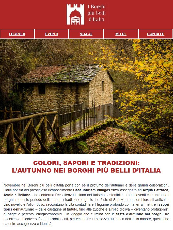 La nostra newsletter sarà anche un modo per scoprire storie ed aneddoti emozionanti, tradizioni locali, ricette regionali, storie di vita e interviste con gli abitanti dei borghi. Sono racconti autentici che ti faranno entrare nel cuore della cultura dei piccoli gioielli dell’Italia più vera.