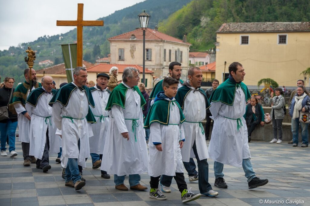 Il Giovedì Santo i carrugi si riempiono del suono profondo dei corni, realizzati con corteccia di castagno secondo un sapere tramandato nel tempo, e delle tabulae, tavolette di legno percosse con un bastone di ferro. La sera si celebra la Cena del Signore, accompagnata dai canti penitenziali delle quattro confraternite storiche del paese: Neri, Verdi, Rossi e Azzurri.