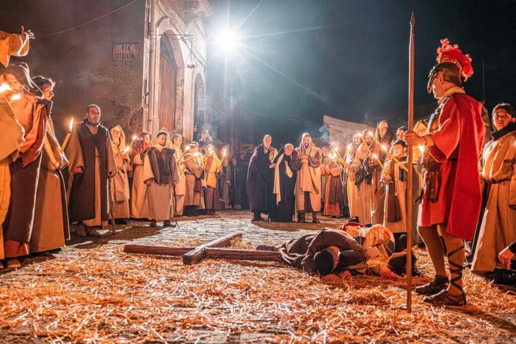 Tra gli elementi più caratteristici spiccano i tredici soldati romani a cavallo, detti “i Giudei”, insieme ai personaggi della Via Crucis, come la Veronica e le tre Marie, che si aggiungono lungo il percorso rendendo la rappresentazione ancora più coinvolgente. Particolarmente sentita è anche l’asta pubblica che assegna i ruoli principali, mentre i bambini, vestiti di bianco, portano i simboli della Passione: il gallo, i chiodi, il calice e le scalette, contribuendo a creare un’atmosfera unica e toccante.
