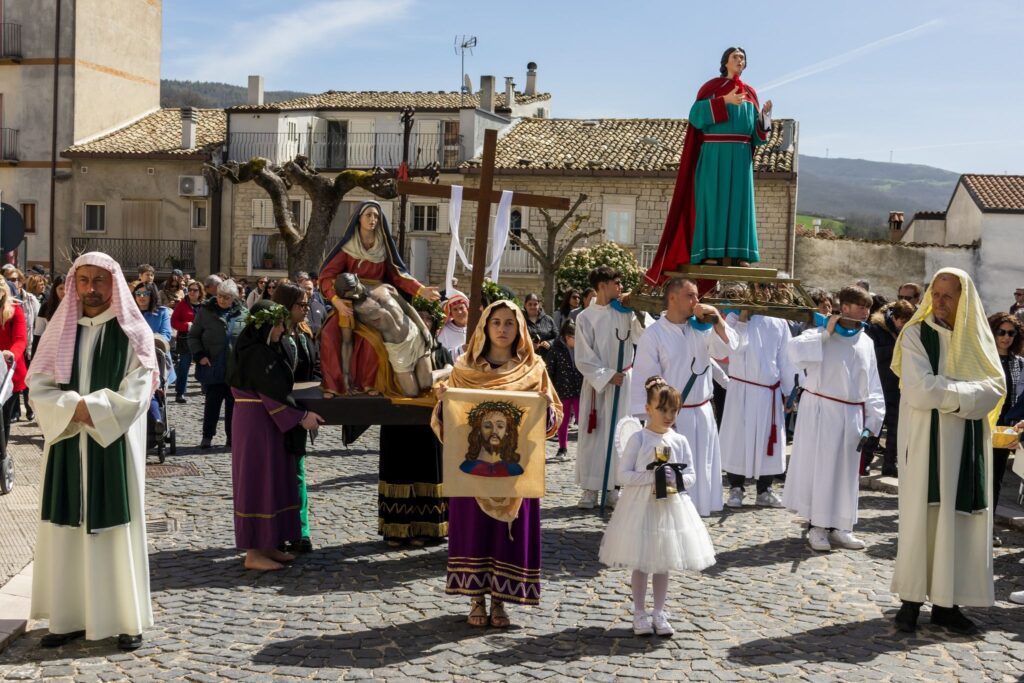 La sacra rappresentazione, nella mattinata del Venerdì Santo, rievoca con grande fedeltà e forte impatto emotivo la Passione di Cristo: oltre cinquanta figuranti animano il corteo, mentre Gesù, la Madonna e San Giovanni sono rappresentati da statue in cartapesta realizzate secondo l’antica tecnica napoletana della “conocchia”.