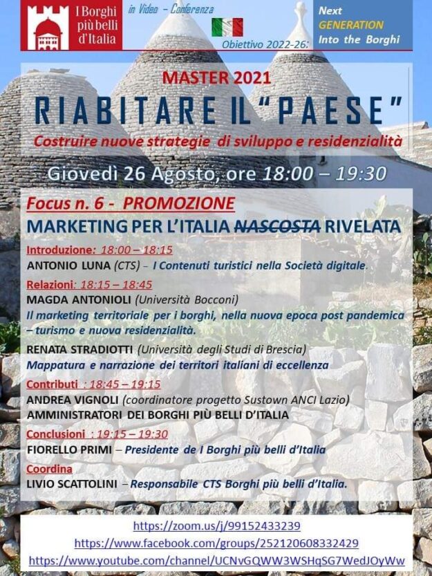 Dettagli6° appuntamento del ciclo di Webinar “RIABITARE IL PAESE” a cura dei Borghi più belli d‟Italia. Clicca per collegarti https://zoom.us/j/99152433239 https://www.facebook.com/groups/252120608332429 https://www.youtube.com/channel/UCNvGQWW3WSHqSG7WedJOyWw COMUNICATO STAMPA Nel 2021 nasce la 1° edizione dei Webinar organizzati dall’Associazione I Borghi più belli d’Italia: un ciclo di video-conferenze su problematiche post pandemiche, sviluppo locale e turismo…